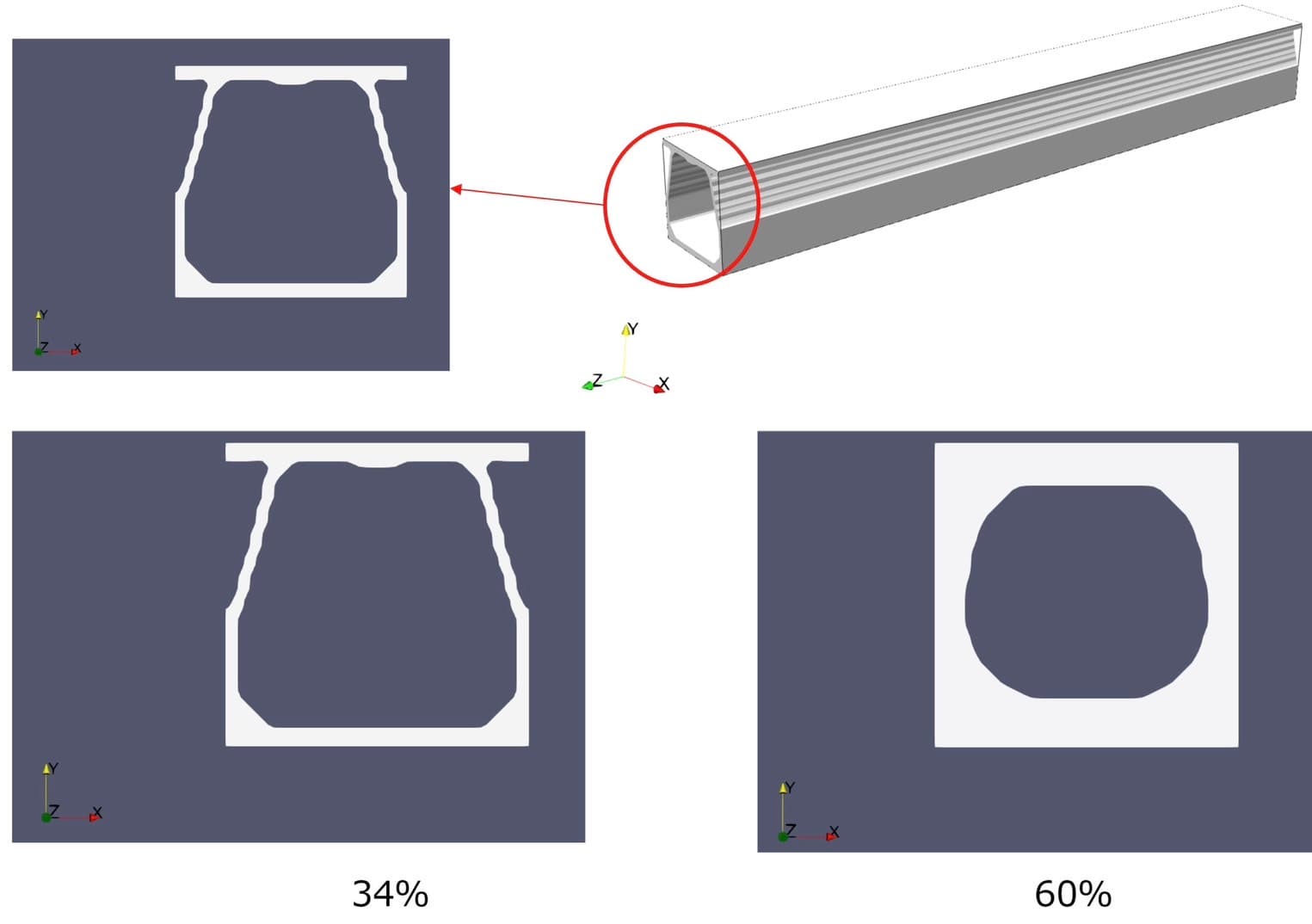 材料の配置を最適化し、型材の軽量化と強度の向上を実現。無駄な材料を削減しつつ、必要な部分に適切な強度を確保します。