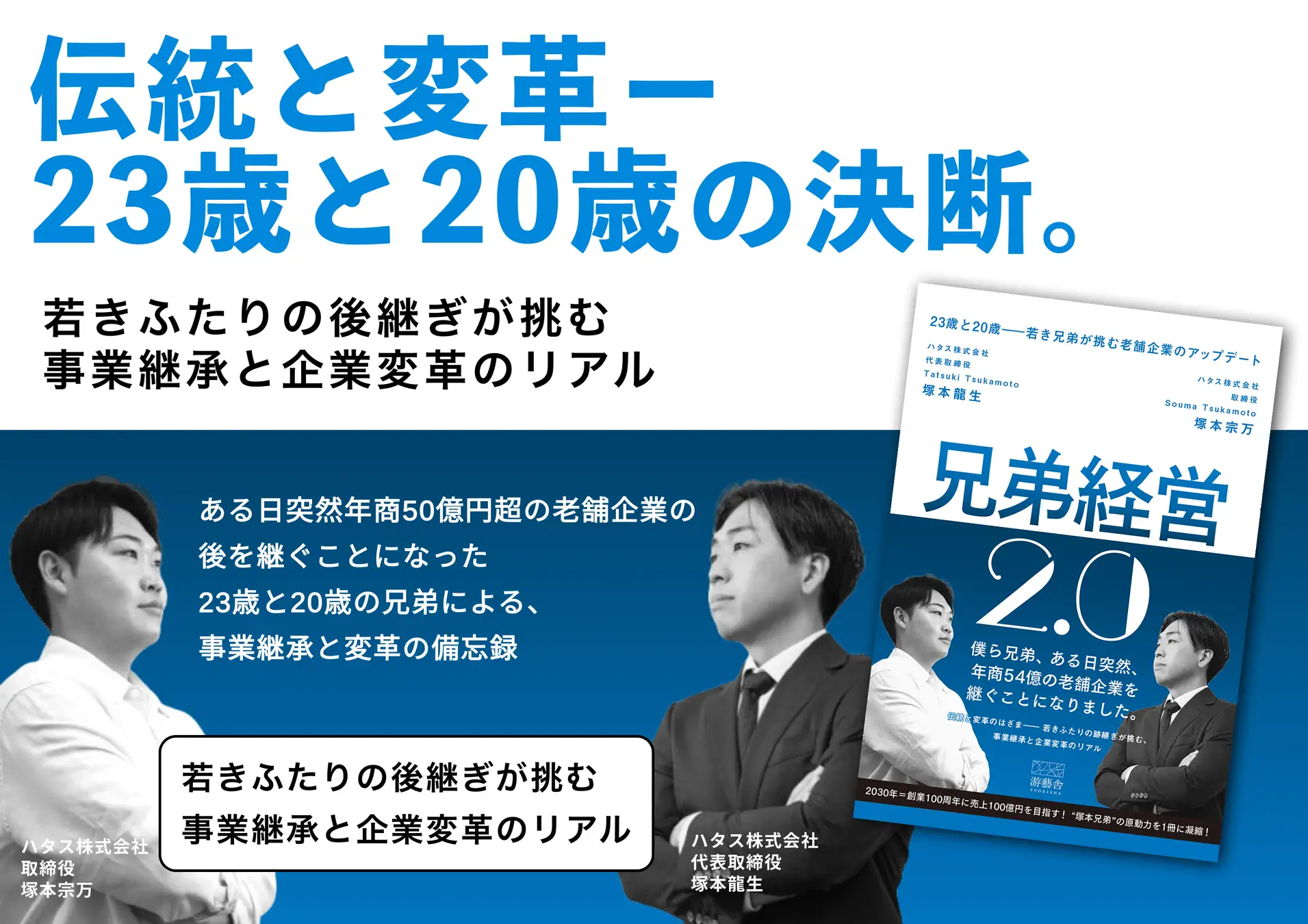 建設・不動産業のハタス株式会社(愛知県刈谷市、代表取締役社長:塚本龍生)は、代表取締役社長の塚本龍生(25歳)と取締役の塚本宗万(22歳)による共著書籍『兄弟経営2.0 -23歳と20歳—若き兄弟が挑む老舗企業のアップデート-』を2025年11月30日に発売いたします。現在Amazonにて予約受付中です。本書は、創業95年・年商54億円の老舗企業を、突然の事業継承で引き継いだ若き兄弟経営者の2年間の軌跡を赤裸々に綴った経営実録書です。