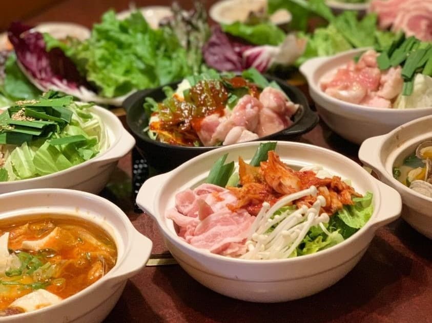鍋の種類は、もつ鍋醤油、ごま、辛いの、スンドゥブチゲ、アサリ鍋、台湾アサリ鍋、キムチ鍋の7種類あります。
