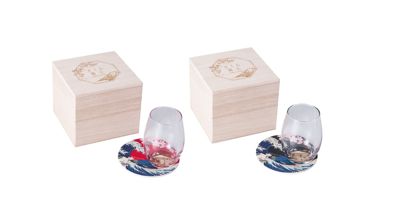 グラスの底面に富士の山頂部分を、コースターにはその山頂部分が欠けた風景を描き、グラスをコースターにのせることで1つの風景が完成します。
