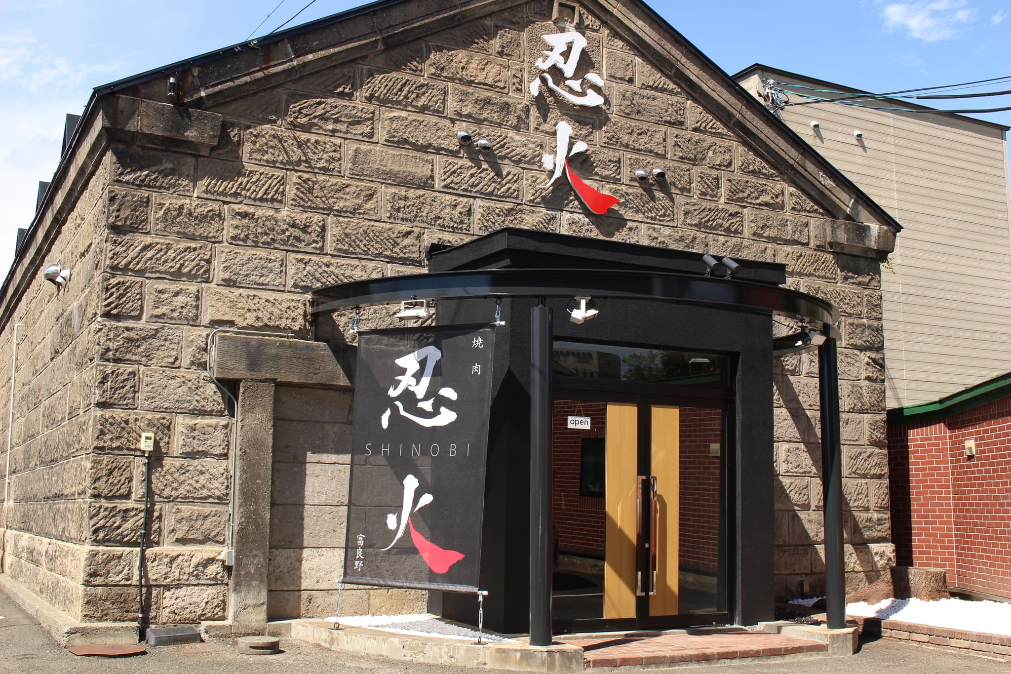 焼肉「忍火」は、JR富良野線富良野駅出口より徒歩約3分の好立地。お店の外観は1911年に酒造倉庫として建てられ、現在もほとんど当時の姿を留めています。