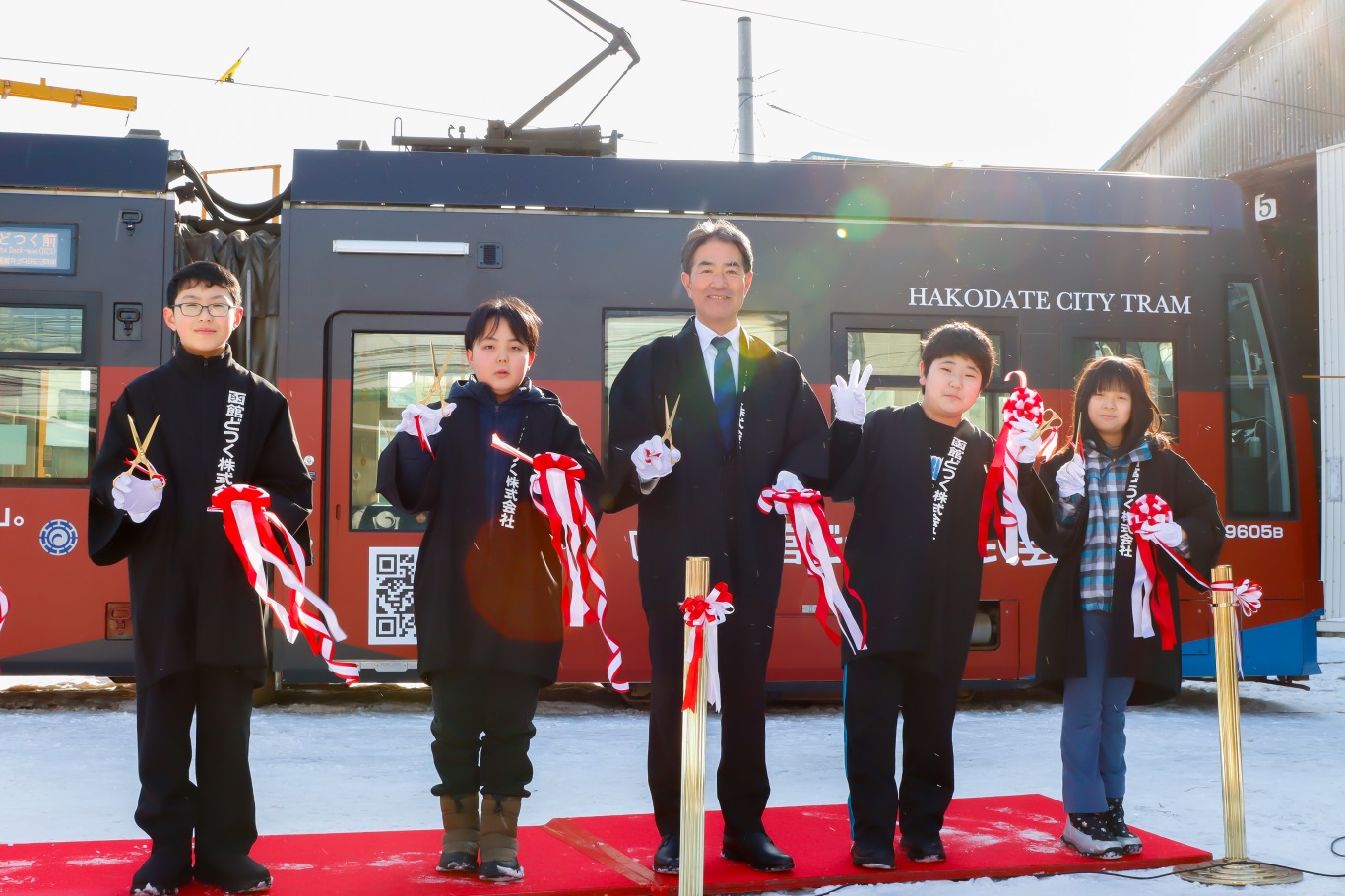 1月18日に行われた出発進行式および体験乗車には、函館市立柏野小学校5年生の児童の皆様や保護者の方々に多数ご参加いただき、子どもたちの元気な「出発進行」の合図と共に本車両が動き出し、和やかな雰囲気の中で運行の安全を祈願いたしました。