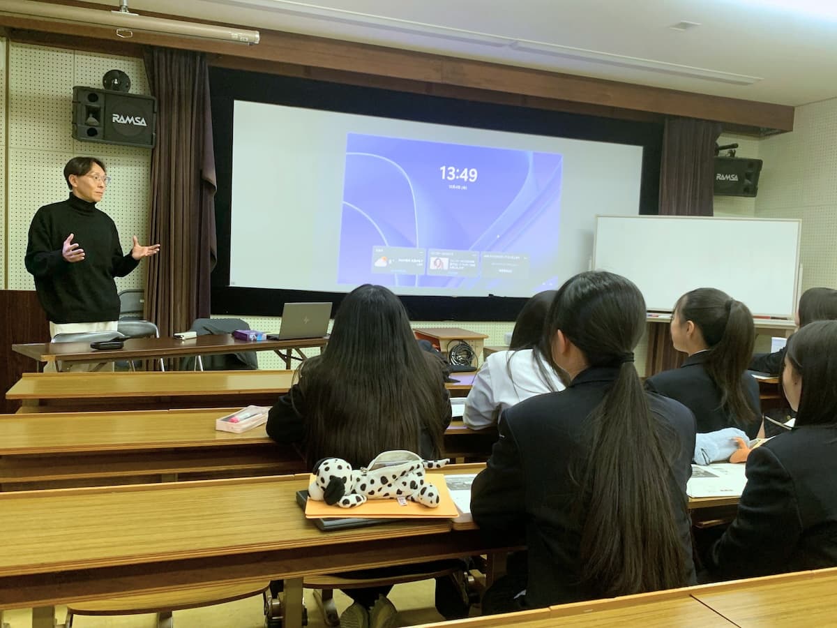 当日の授業では、当社の設計士とインテリアコーディネーター(以下:IC)が登壇し、建物づくりの流れや空間デザインの考え方を、実例を交えながらわかりやすく解説しました。