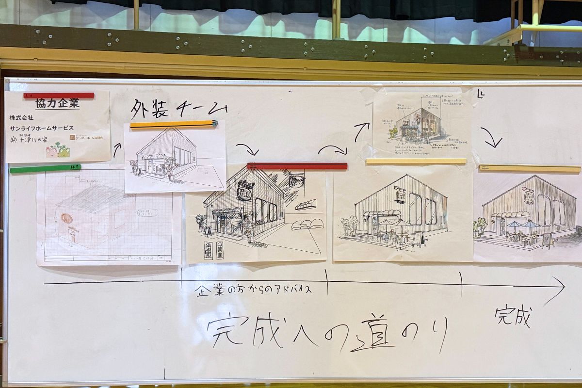 本プロジェクトでは、生徒たちは設計チーム・飲食チーム・土地チームに分かれ、それぞれの視点から「入りやすいお店」について検討を行いました。