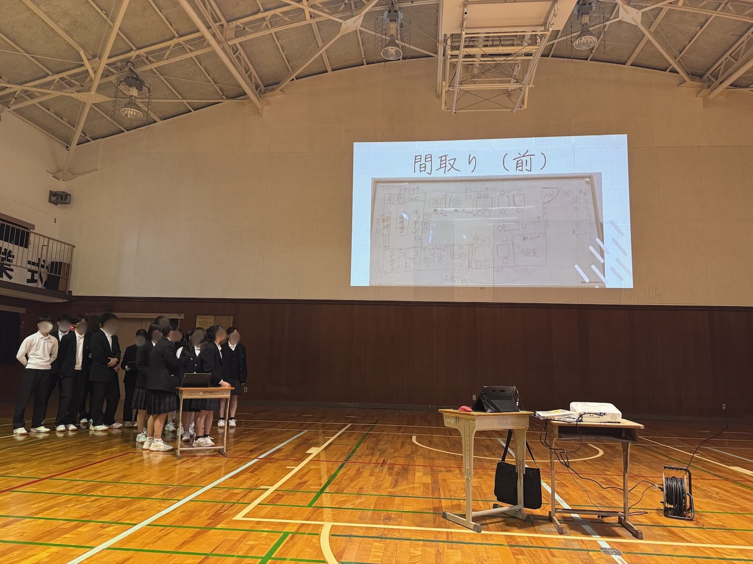 最初の授業では、設計士とインテリアコーディネーターが学校にて出前授業を実施し、「建物を建てるとはどういうことか」「建物を建てる仕事の流れ」などについて講義を行いました。