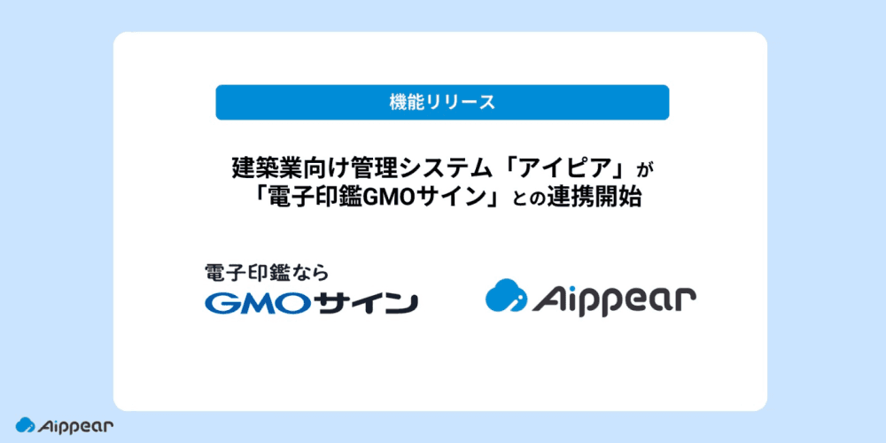 株式会社アイピア(本社:兵庫県神戸市中央区、代表取締役:森 輝三章)が提供する「建築業向け業務管理システム アイピア(以下、アイピア)」(https://www.aippearnet.com/)は、GMOグローバルサイン・ホールディングス株式会社(本社:東京都渋⾕区、代表取締役:⻘⼭ 満)が提供する「電子印鑑GMOサイン」(以下、GMOサイン)」との機能連携を開始いたしました。