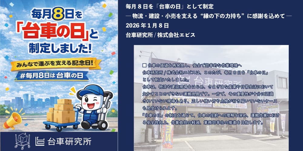 株式会社エビス/台車研究所(エビス/ダイシャケンキュウショ、所在地:大阪府東大阪市、代表取締役:松本学)は、2026年1月8日に、毎月8日を「台車の日」として制定いたしました。