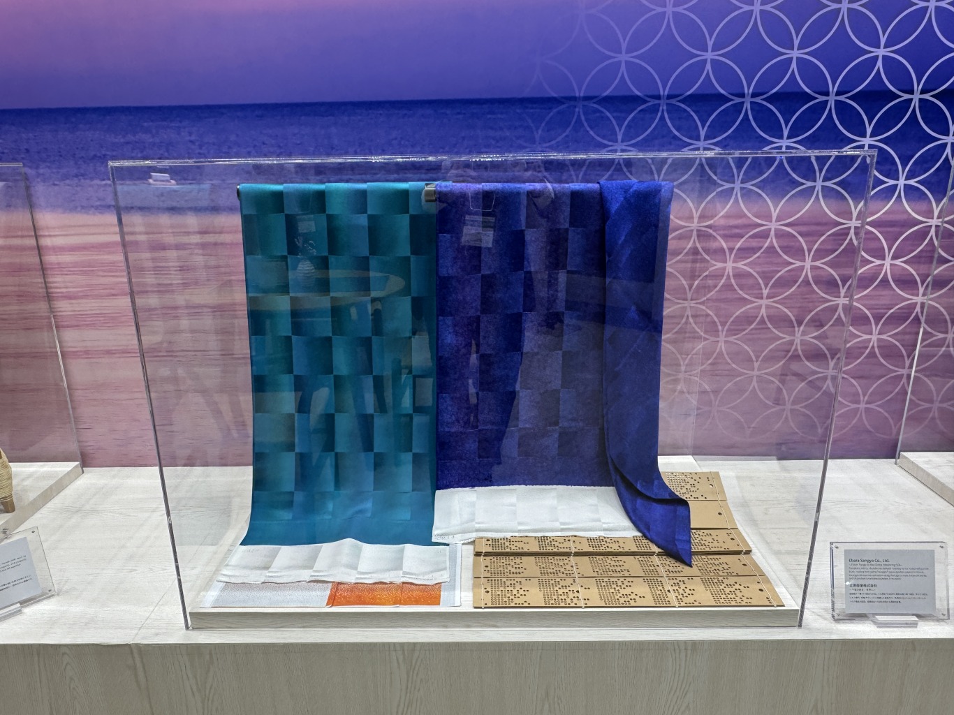 今回開催されたツーリズムEXPOジャパン2025では、エアロトヨタ様のブースにて、create ebara の原点となるシルクジャカード「市松グラデーション」に、曜変天目茶碗の美しさをイメージした染色技法で創られたブルーの反物と、日本の伝統技法である引き染めで2色をぼかしたグリーンの反物が展示されました。その曜変天目染で新たに創られたブルーのスカーフも展示してあります。