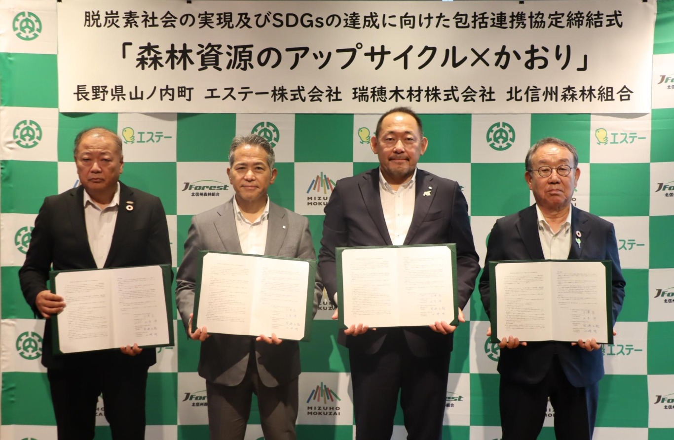 2024年10月には、エステー株式会社・瑞穂木材株式会社・北信州森林組合・山ノ内町の4者において、包括連携協定を締結し、正式にプロジェクトをスタートしました。