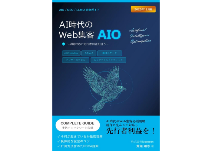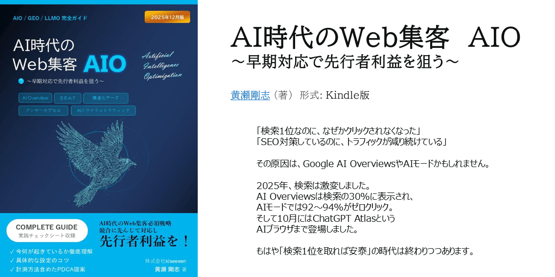 株式会社kiseeeen(キセーン、所在地:大阪府大阪市)の代表取締役・黄瀬剛志が、AI検索時代のWeb集客戦略を解説した書籍『AI時代のWeb集客 AIO ―早期対応で先行者利益を狙う―』をAmazon Kindleにて出版いたしました。