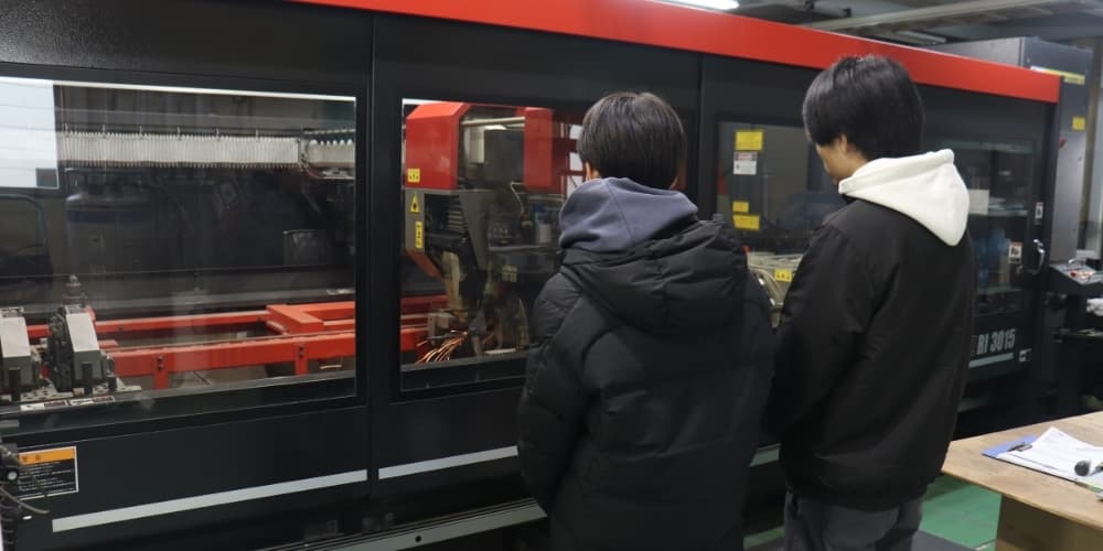 学生の設計データを基にパイプを精密カット。ミリ単位の精度を共に確認する現場教育を通じ、理論を実体験に変える「対話型」の加工支援を行いました。