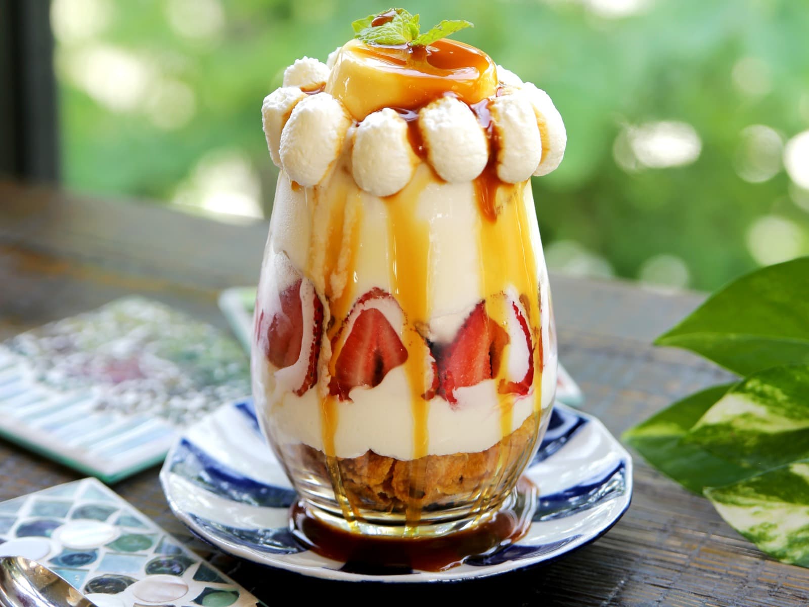 このパフェはコーンフレーク、生クリーム、イチゴとベリー、ソフトクリーム、プリンの順で構成されています。