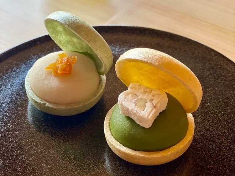 写真はゆずと抹茶のモナロンで、右は抹茶の餡にクルミ入りクリームチーズ、左はイチジクの餡にあんずジャムがのっています!