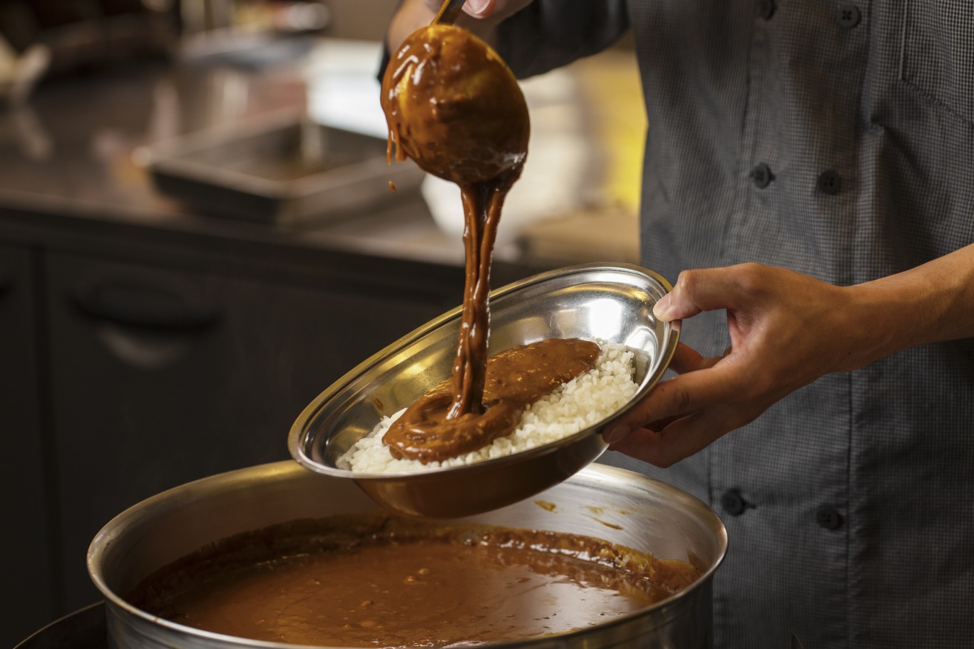 弊社のカレーはまずルーを焙煎し、具材を加熱加工したのちに具材とルーを混合して最終加熱するという、ルー作りから始まる3つのステップで製造していることが特徴です。ルーは低温で時間をかけて焙煎することでスパイスや風味が飛ぶのを抑え、他の老舗店舗とは異なるフレッシュな味わいに仕上げています。また、金沢カレーは普通のカレーと比べて濃いめの味であることが特徴ですが、味のコアとなるのがアミノ酸を使用した調味料です。この調味料は西洋料理のソースのベースとなる出汁「フォン」の代替品として開発され、独特の旨味をプラスしております。