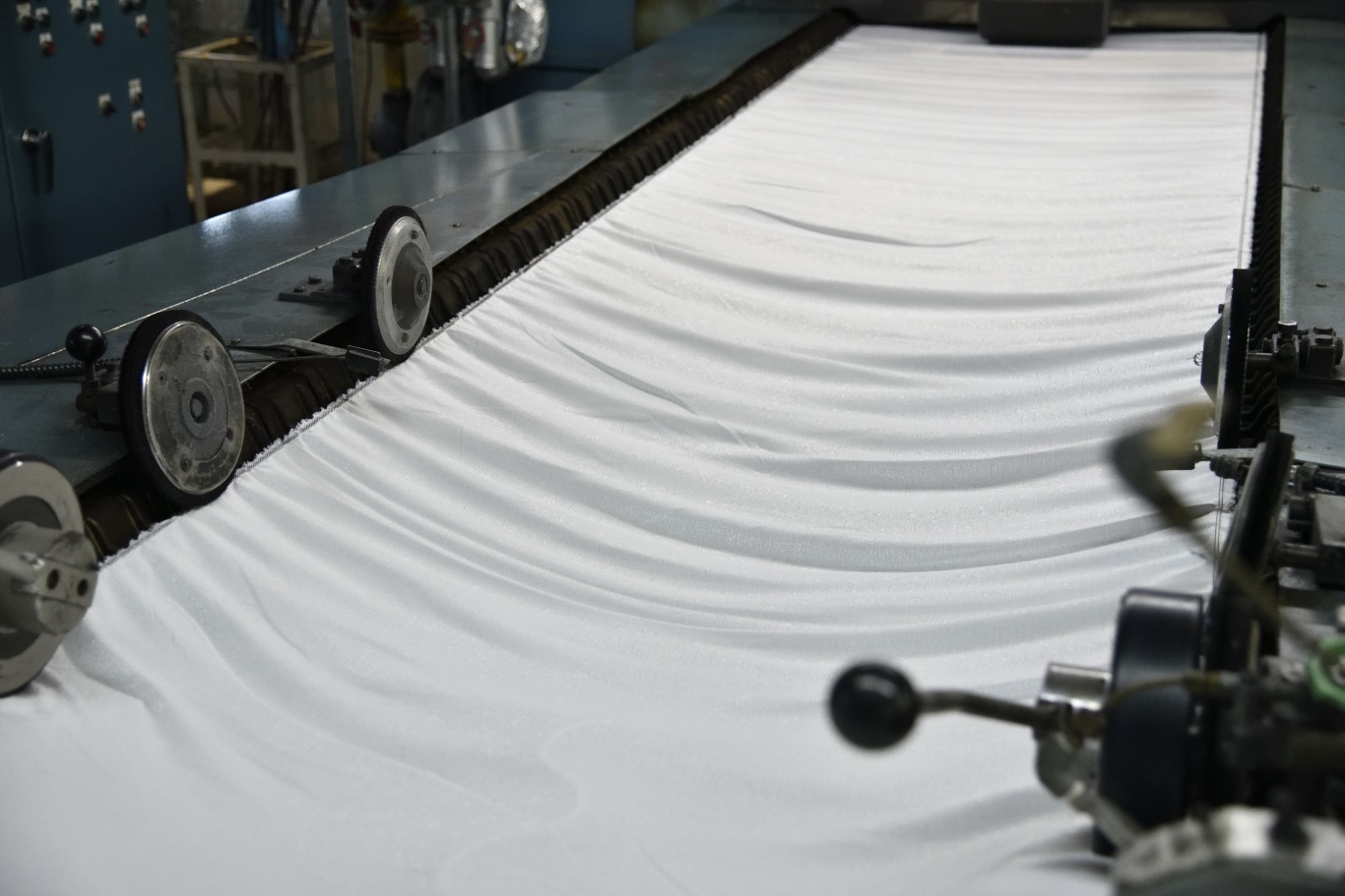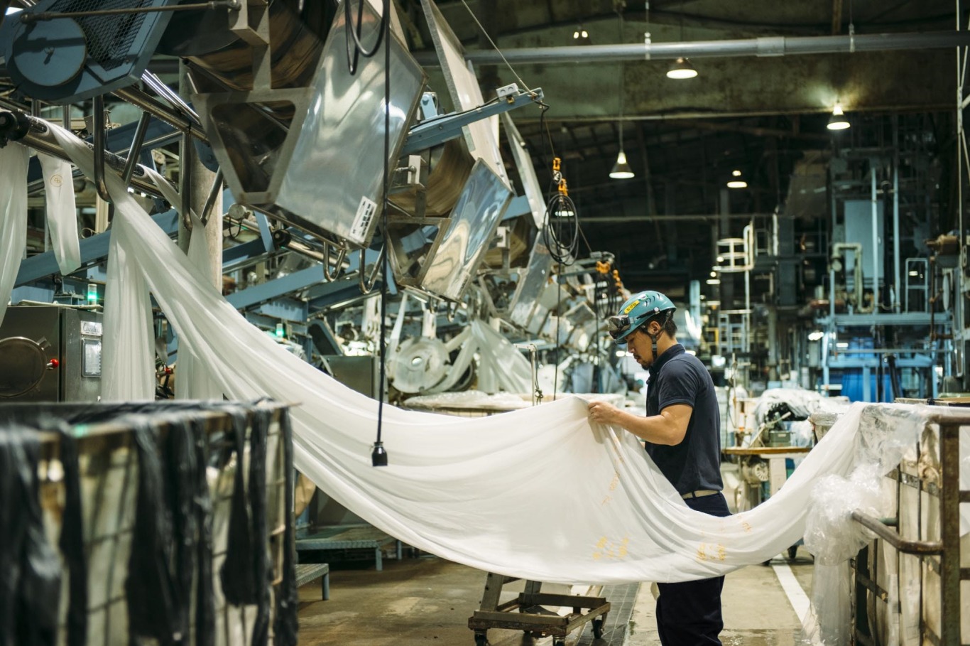 創業当初は絹など天然繊維の染色加工を行っておりましたが、1958年からはナイロン織物、1960年からはポリエステル長繊維織物の染色加工を開始し、現在はほぼ100%合成繊維を取り扱っております。合成繊維は軽量性・耐久性・速乾性・寸法安定性といった特長を持っており、それに当社独自の染色やコーティング・フィルム加工・撥水加工等を施すことでさらなる付加価値を加え、機能性と快適性を高めています。
