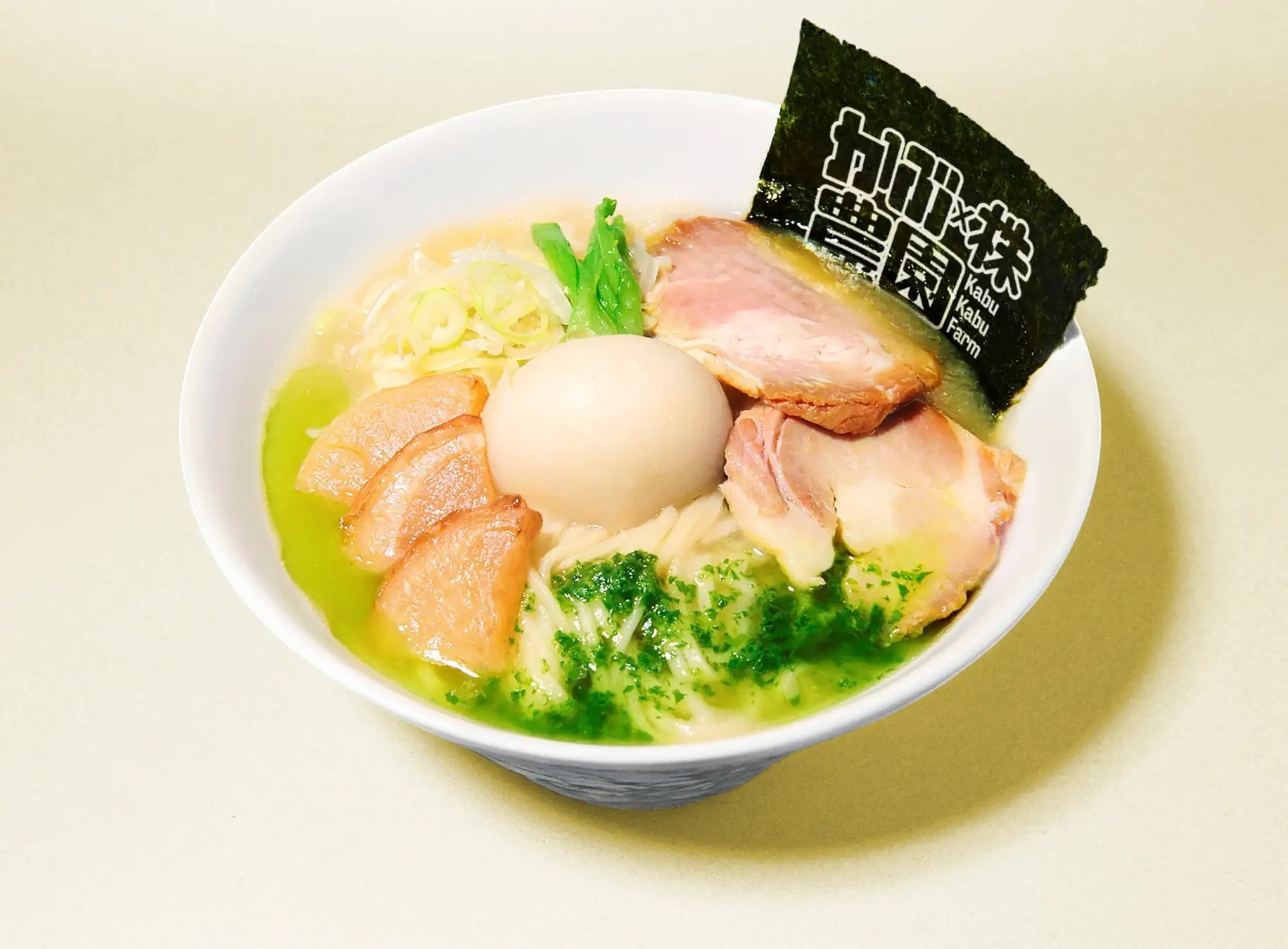トッピングには存在感のある葉付き蕪を配し、さらに蕪の身の素揚げ、蕪の葉オイルをあしらった“蕪尽くし”のビジュアル。白と緑のコントラストが美しく、シンプルでありながら印象に残る一杯に仕上げています。