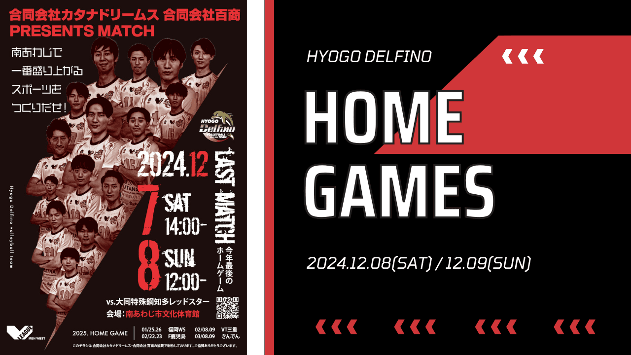 V.LEAGUE 西地区に所属する男子バレーボールチーム・兵庫デルフィーノは2024年12月7日(土)・8日(日)に南あわじ市文化体育館にて年内ラストのホームゲームを開催いたします。